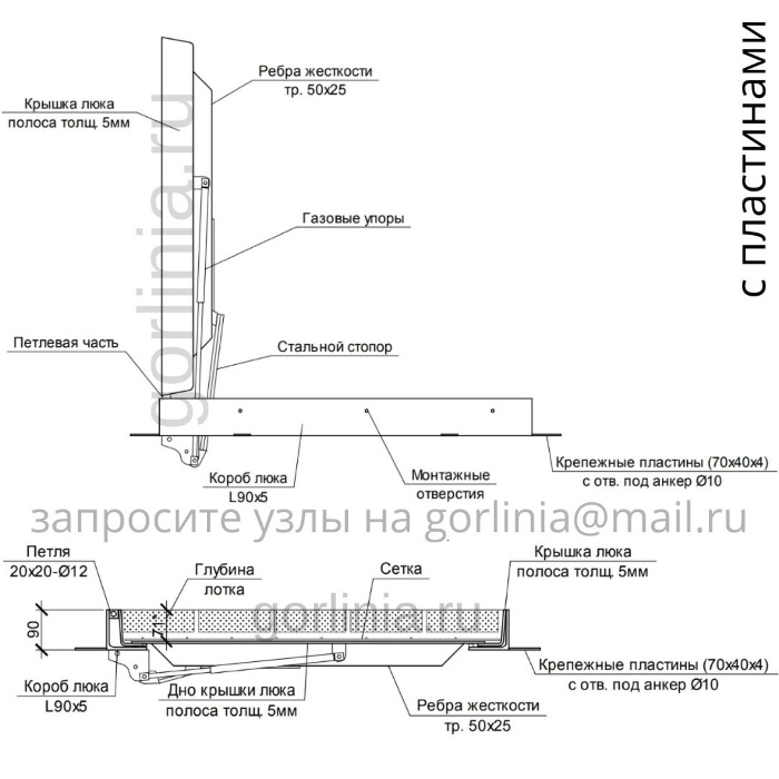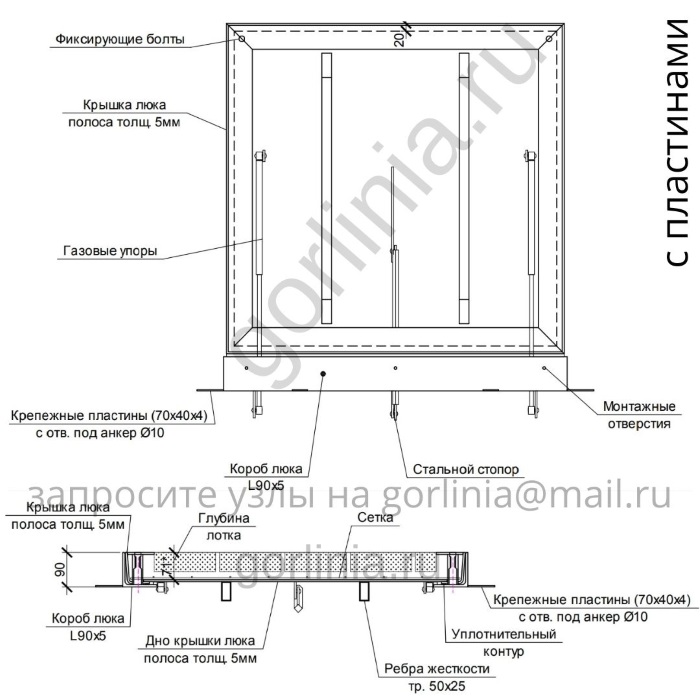 Коробка сварена из стали AISI 304 с толщиной стенки 5/6 мм; в дне корыта лист 5/8 мм (параметр зависит от грузоподъемности), снизу армирован профильной трубой 50х25. Тип сварки: аргонно-дуговая сплошным швом с присадками для нержавейки. Дополнительная комплектация: газлифт 2000N.