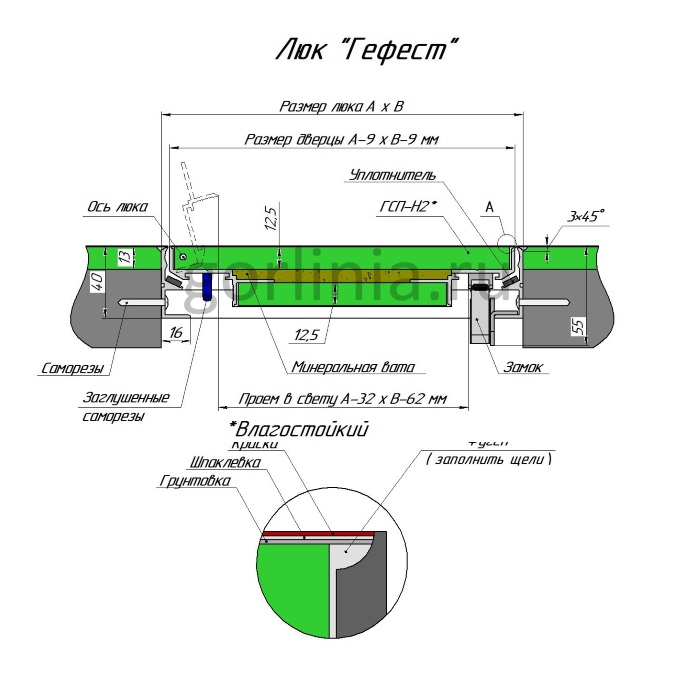 Заполнение распашной дверцы: два контура влагостойкого ГСП-Н2 12,5 мм с проложенной в полости минеральной ватой. По контуру проклеен резиновый уплотнитель для герметизации притвора.