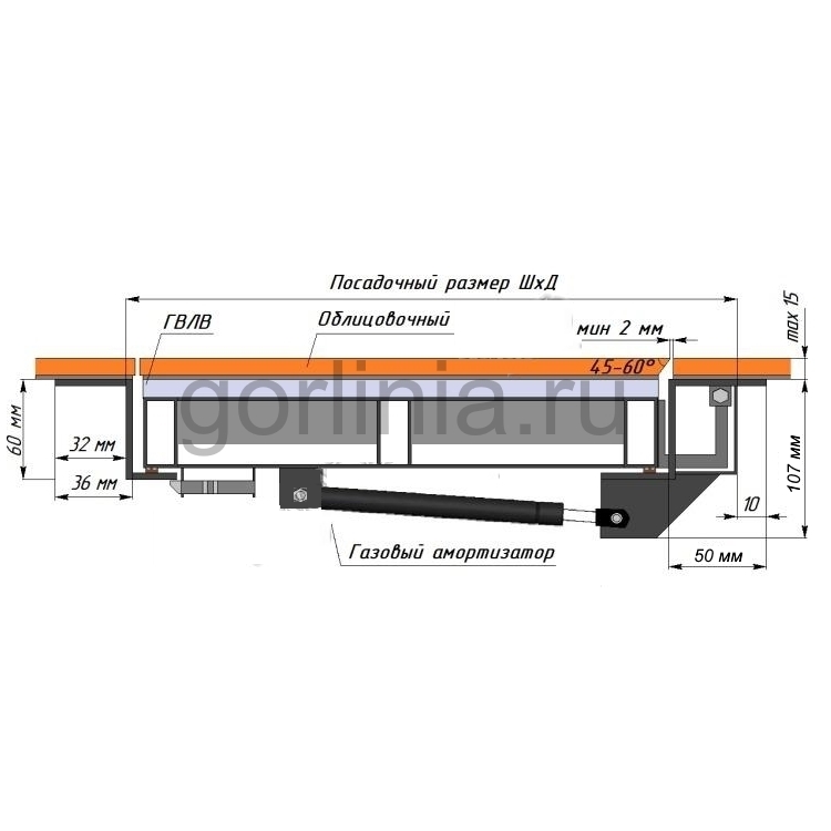 Рама и петлевое соединение из холодного листового проката ХД 3 мм, монтажная глубина 60, вылет в свет в зоне расположения механизма и крепления упоров к коробке 107 мм - см фото в галерее. Каркас полотна с обвязкой сварен из трубы 30х20, зашит плитой ГВЛ под чистовую отделку в уровень монтажной полки короба.